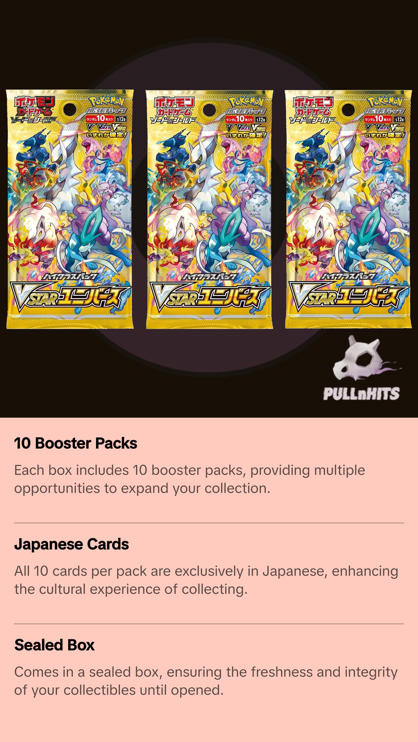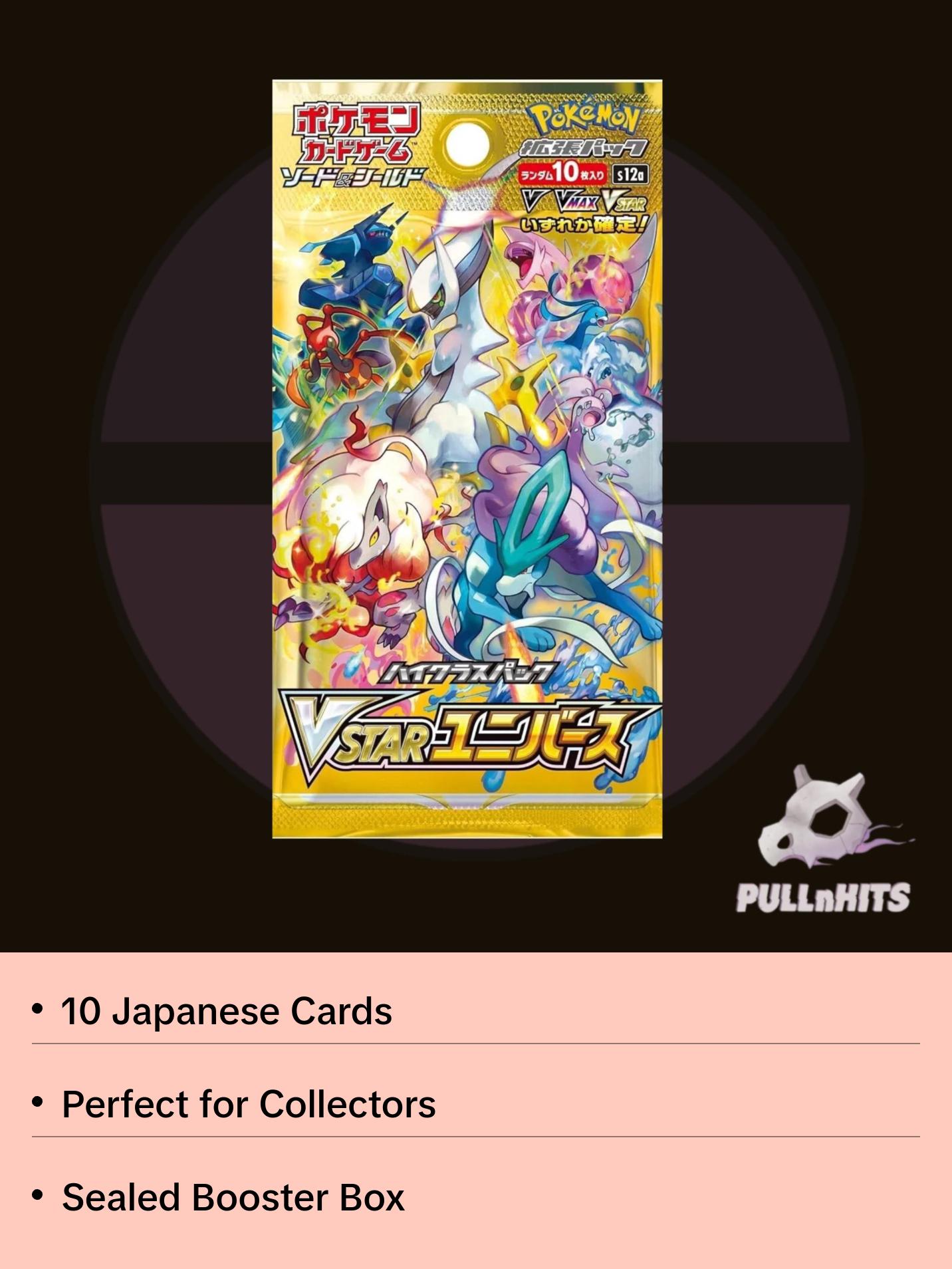 Dive into the world of the Japanese V-Star Universe Booster Box! This sealed box is your gateway to collecting 10 booster packs. Each pack is meticulously designed to enhance your collection with 10 cards, all in Japanese. Perfect for enthusiasts and collectors alike, this box offers a thrilling opportunity to expand your deck.