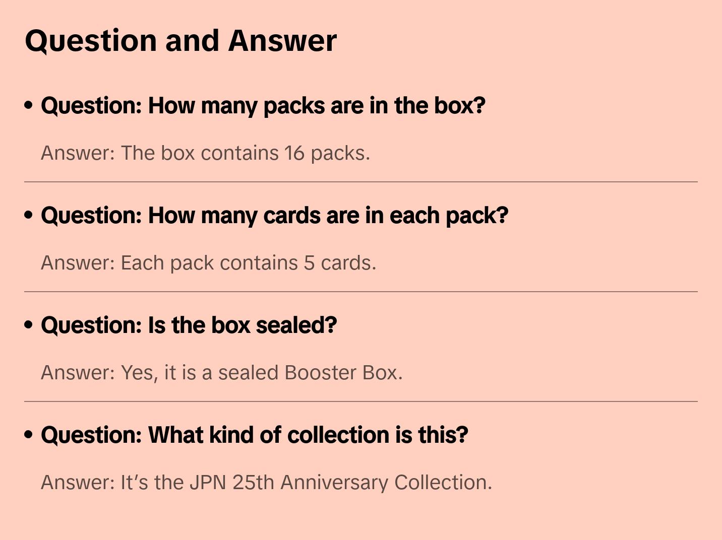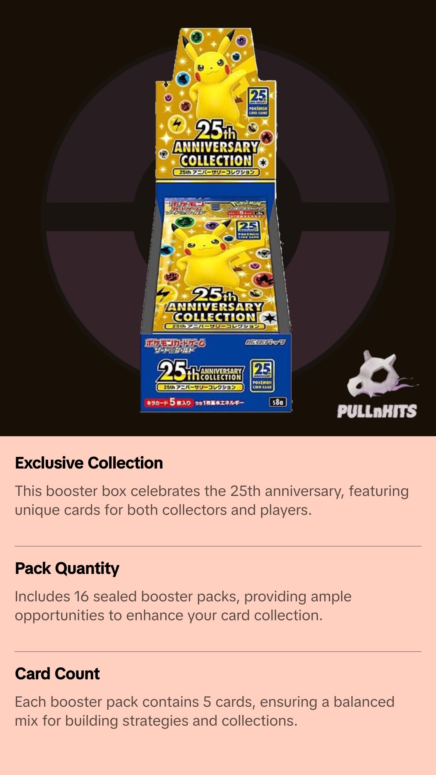 JPN 25th Collection sealed Booster Box contains 16 packs. Each booster pack contains 5 cards.