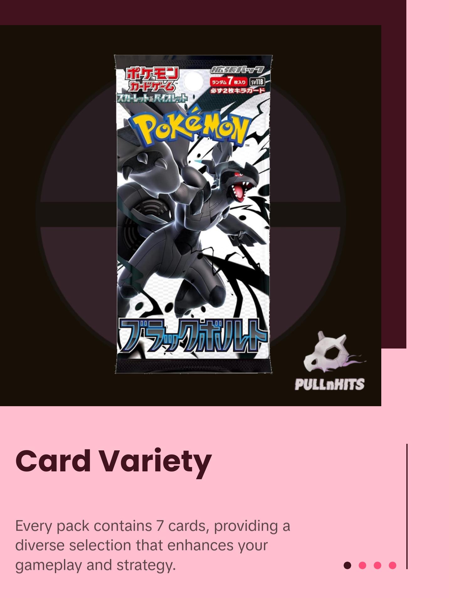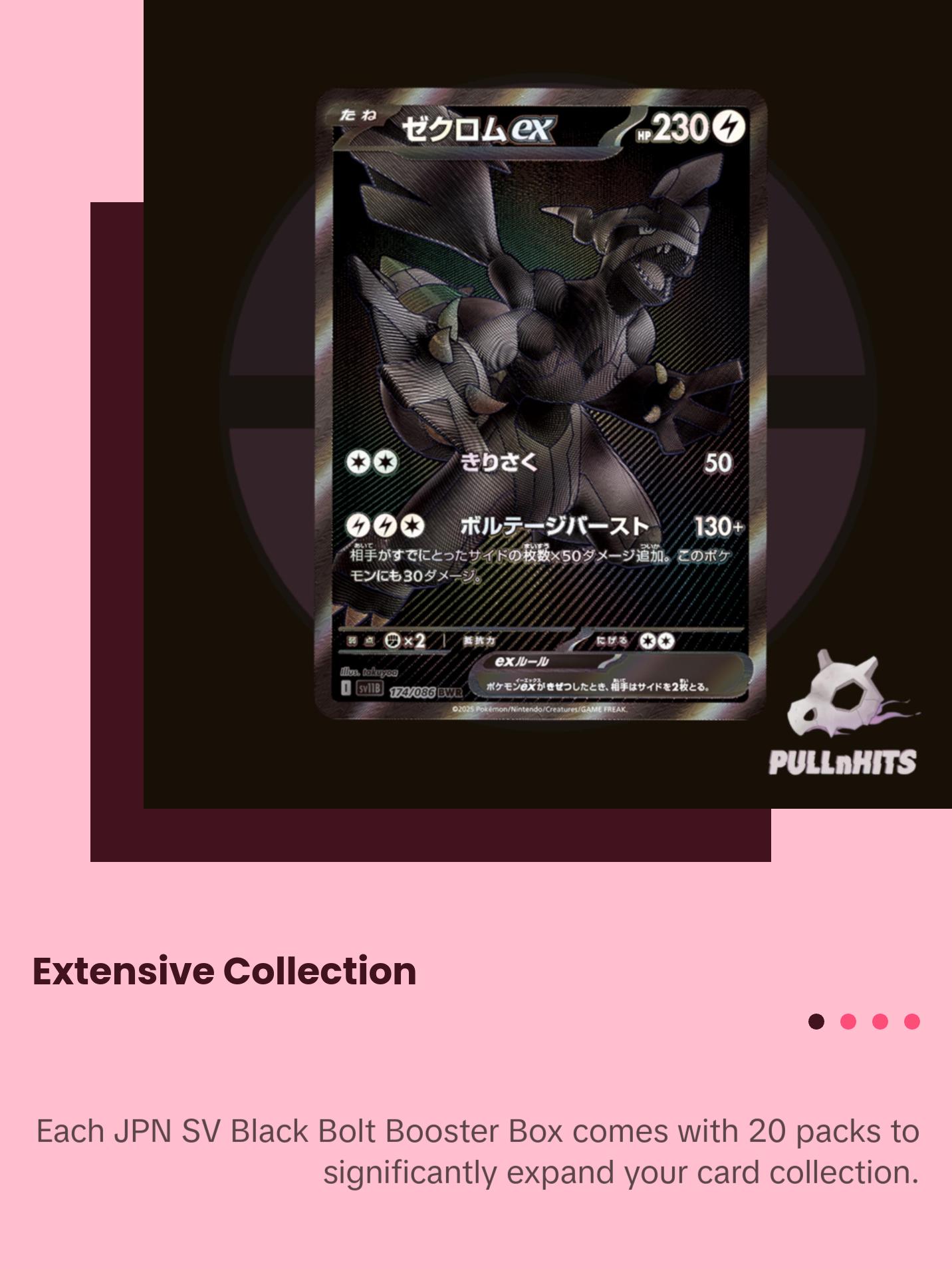 The JPN SV Black Bolt Booster Box is your gateway to exciting Pokémon card collecting. This Japanese booster box contains 20 packs, each filled with anticipation. Perfect for any Pokémon enthusiast, it's a treasure trove of cards to enhance your collection. Dive into the world of Pokémon with every pack.
