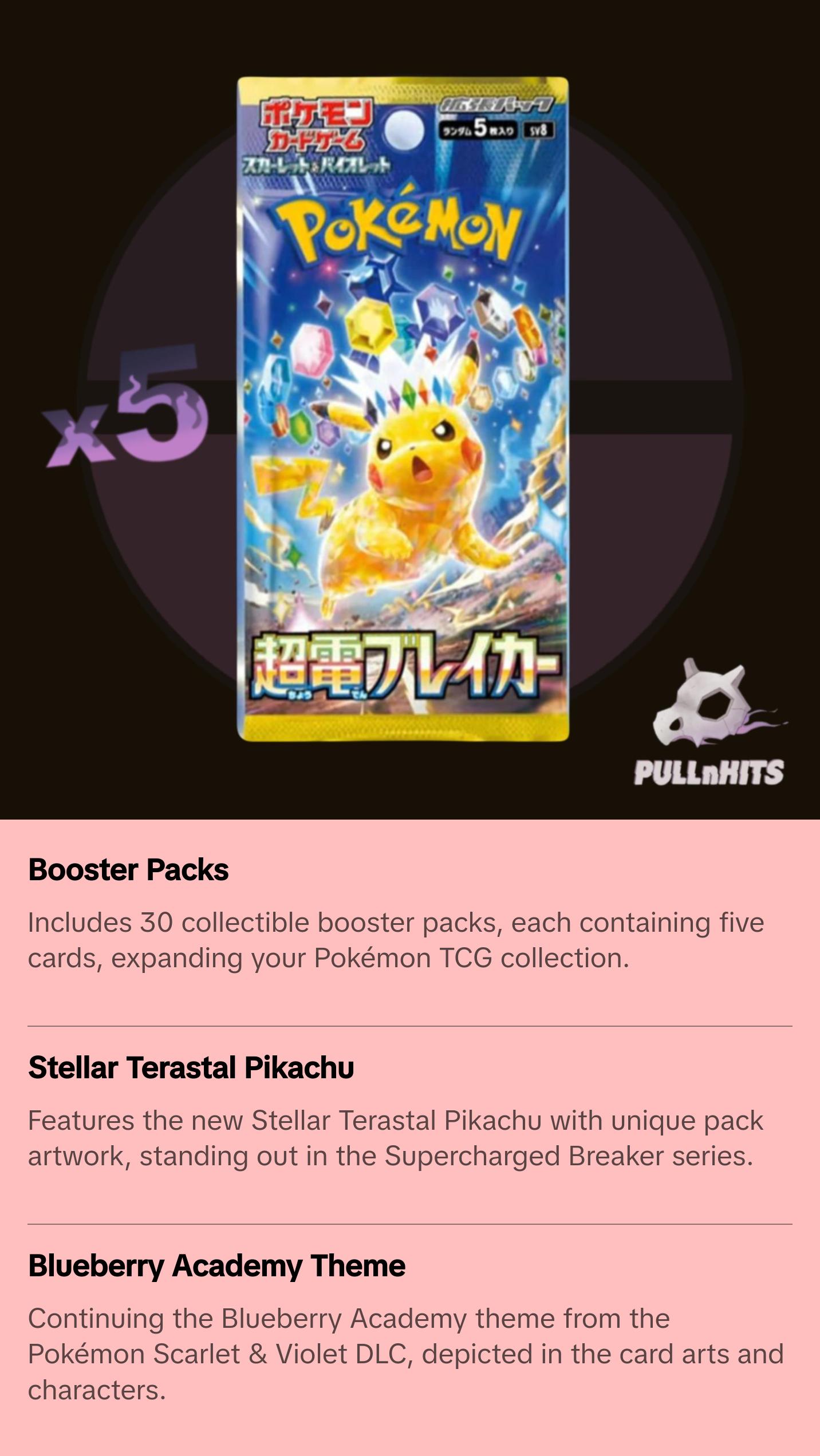 In addition to Pikachu, Supercharged Breaker is expected to continue introducing even more Stellar-type Tera Pokémon ex to the game. There should also be a general theme of Blueberry Academy, the school from Unova featured in the Pokémon Scarlet & Violet game DLC, The Indigo Disk, in the card art, trainers, and Pokémon.