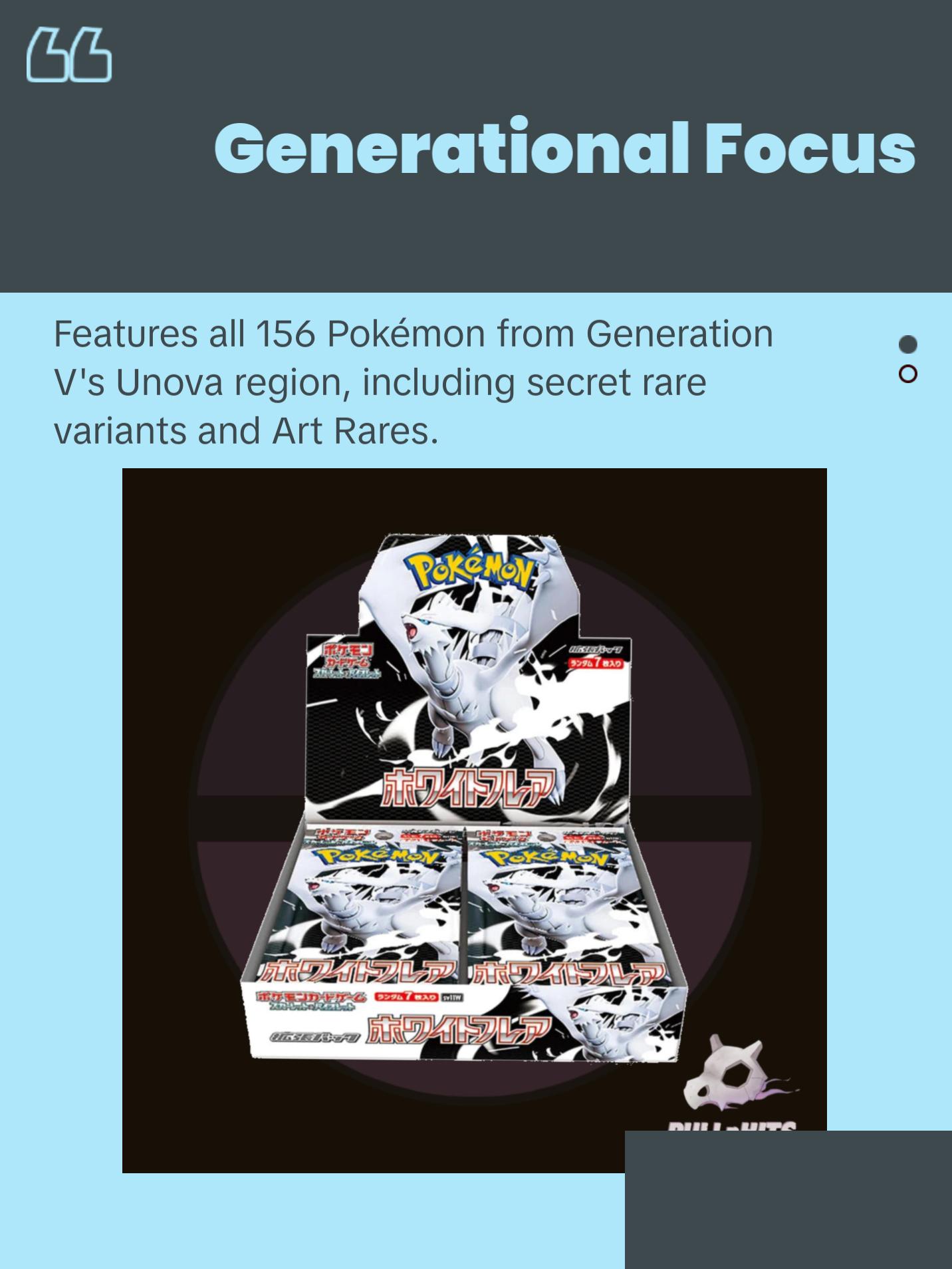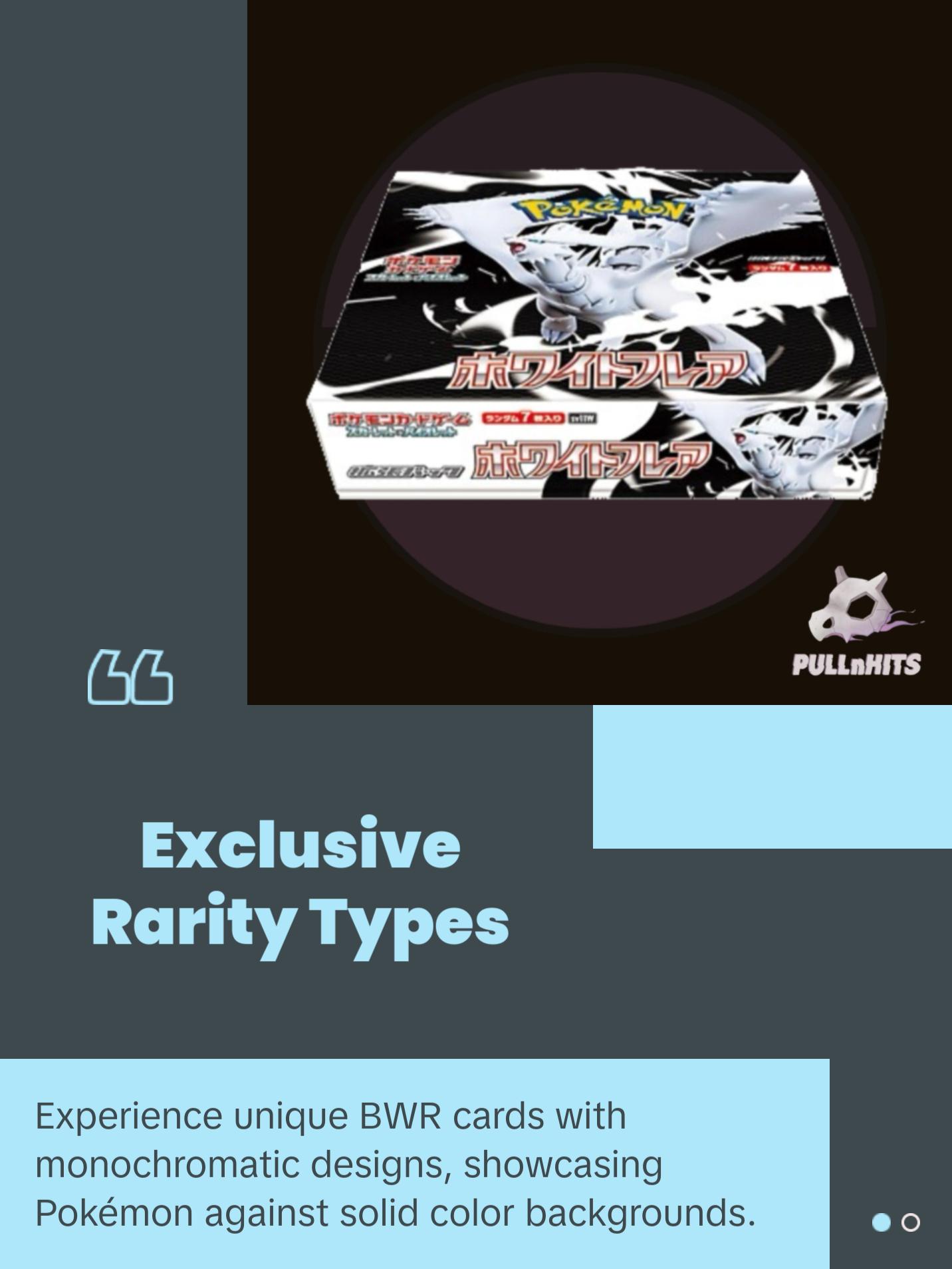• Black Bolt and White Flare are paired sets based on Generation V. Cards feature all 156 Pokémon from the Unova region. Every Pokémon card has a secret rare variant of AR (Art Rare) or better. Tinsel Holofoil cards are reintroduced.