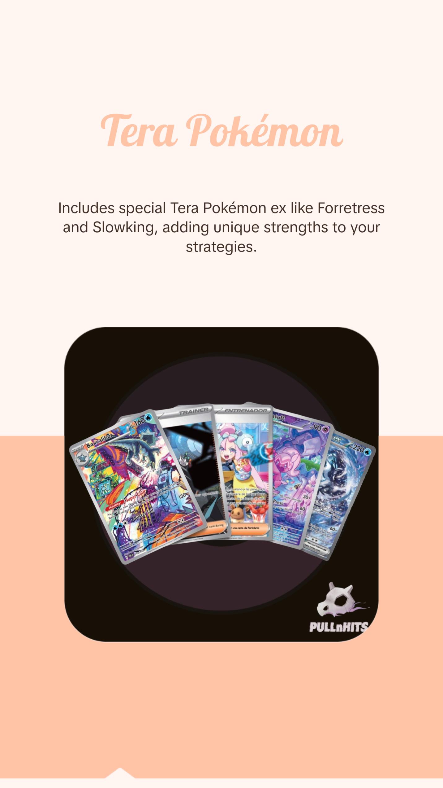 Energy surges as new powers awaken! Meowscarada ex, Skeledirge ex, and Quaquaval ex evolve with mesmerizing magic. Forretress, Slowking, and Dedenne shine as Tera Pokémon ex. Chien-Pao ex, Ting-Lu ex, and others add daunting strengths. Pikachu joins the Pokémon ex party in the Pokémon TCG: Scarlet & Violet—Paldea Evolved expansion!
