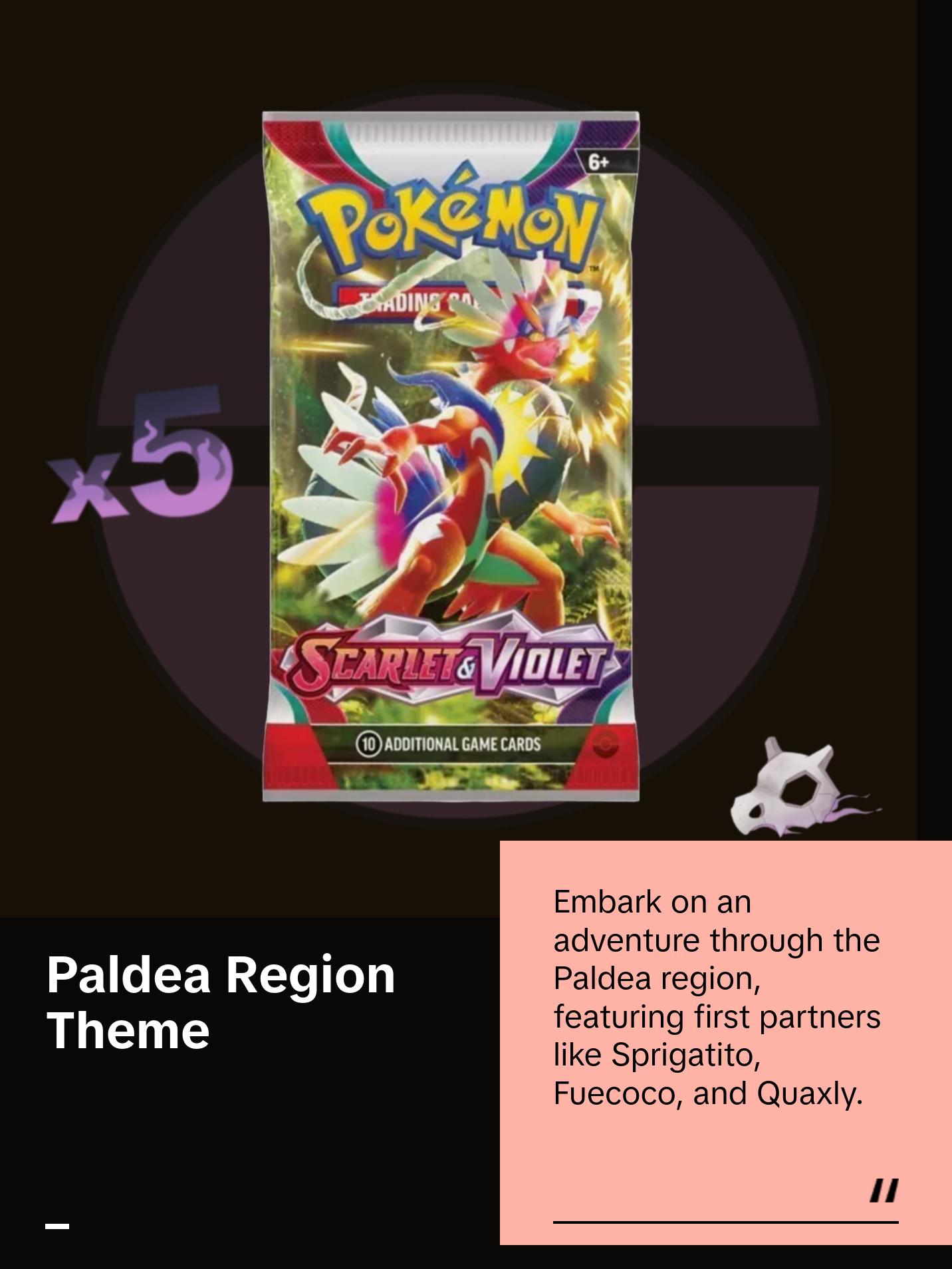 ✨ Set out for a journey in the Paldea region! Meet first partners Sprigatito, Fuecoco, and Quaxly. Explore the power of the Legendary Pokémon Koraidon and Miraidon as Pokémon ex. Discover other Pokémon ex evolving into battle, including Arcanine and Gyarados with a dazzling new look. Even more Pokémon appear as illustration rare cards with amazing artwork. Discover them all in the Pokémon TCG: Scarlet & Violet expansion!