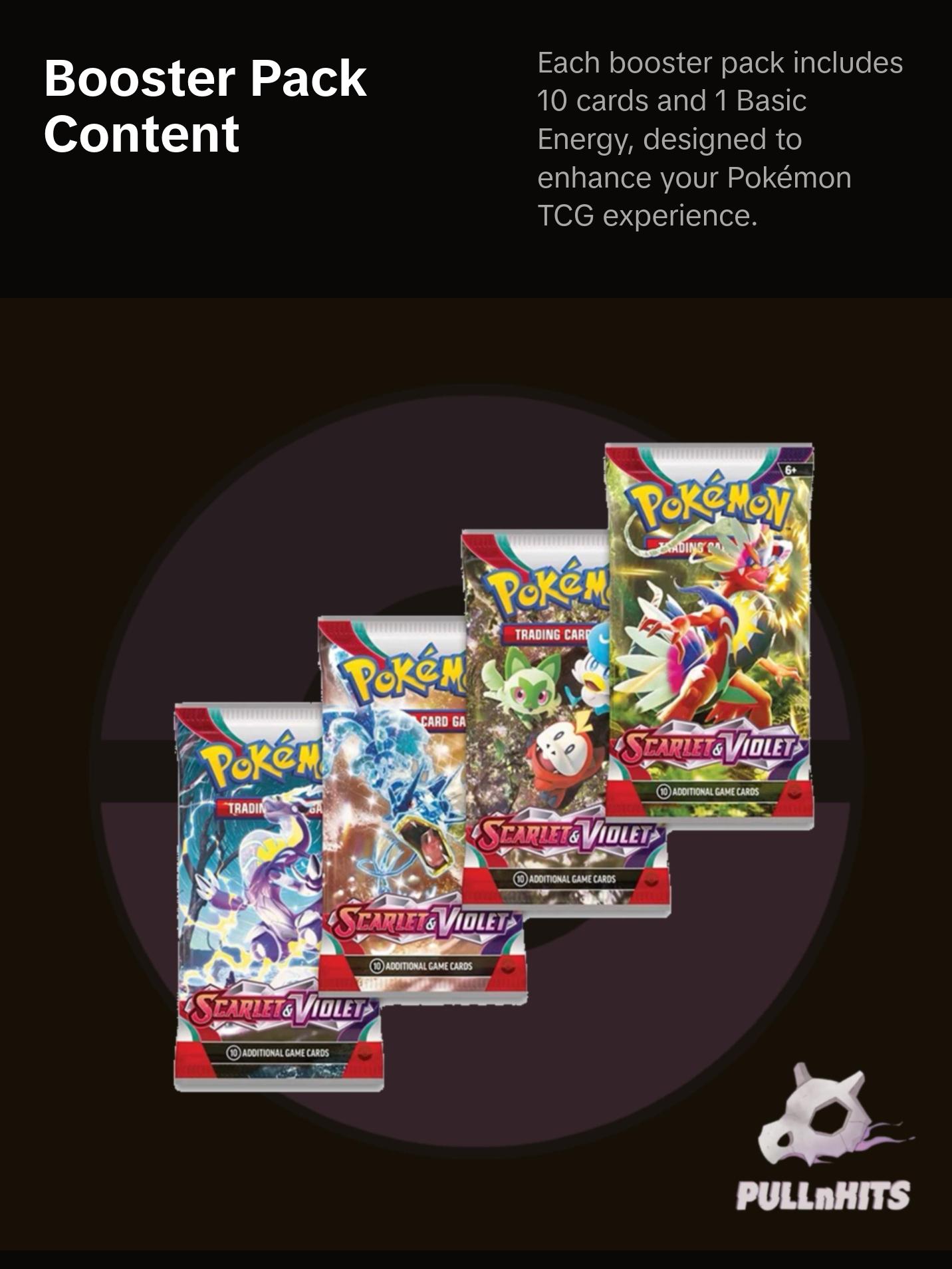 📦 Each booster pack contains 10 cards and 1 Basic Energy. The set includes x1, x5, and x10 booster packs from the Pokémon TCG: Scarlet & Violet expansion. Cards vary by pack. Perfect for expanding your collection and enhancing your gameplay. Get ready to add these exciting new cards to your collection today!