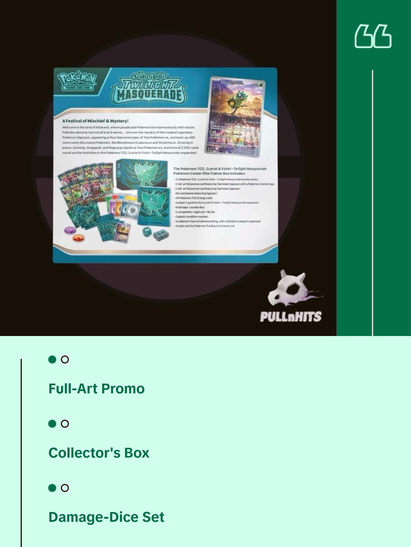 The Elite Trainer Box empowers you to make the most of everything this incredible expansion has to offer. With a whopping nine booster packs, there are plenty of opportunities to dive into incredible cards and Pokémon. Ogerpon exemplifies mischief, and this box gives you a chance to harness its power with a full-art promo card featuring the Mask Pokémon in its Teal Mask form, as well as card sleeves featuring Ogerpon. With damage-counter dice, condition markers, and a collector’s box to keep everything nice and tidy, you have everything you need to thrive in the magical world of the twilight masquerade!