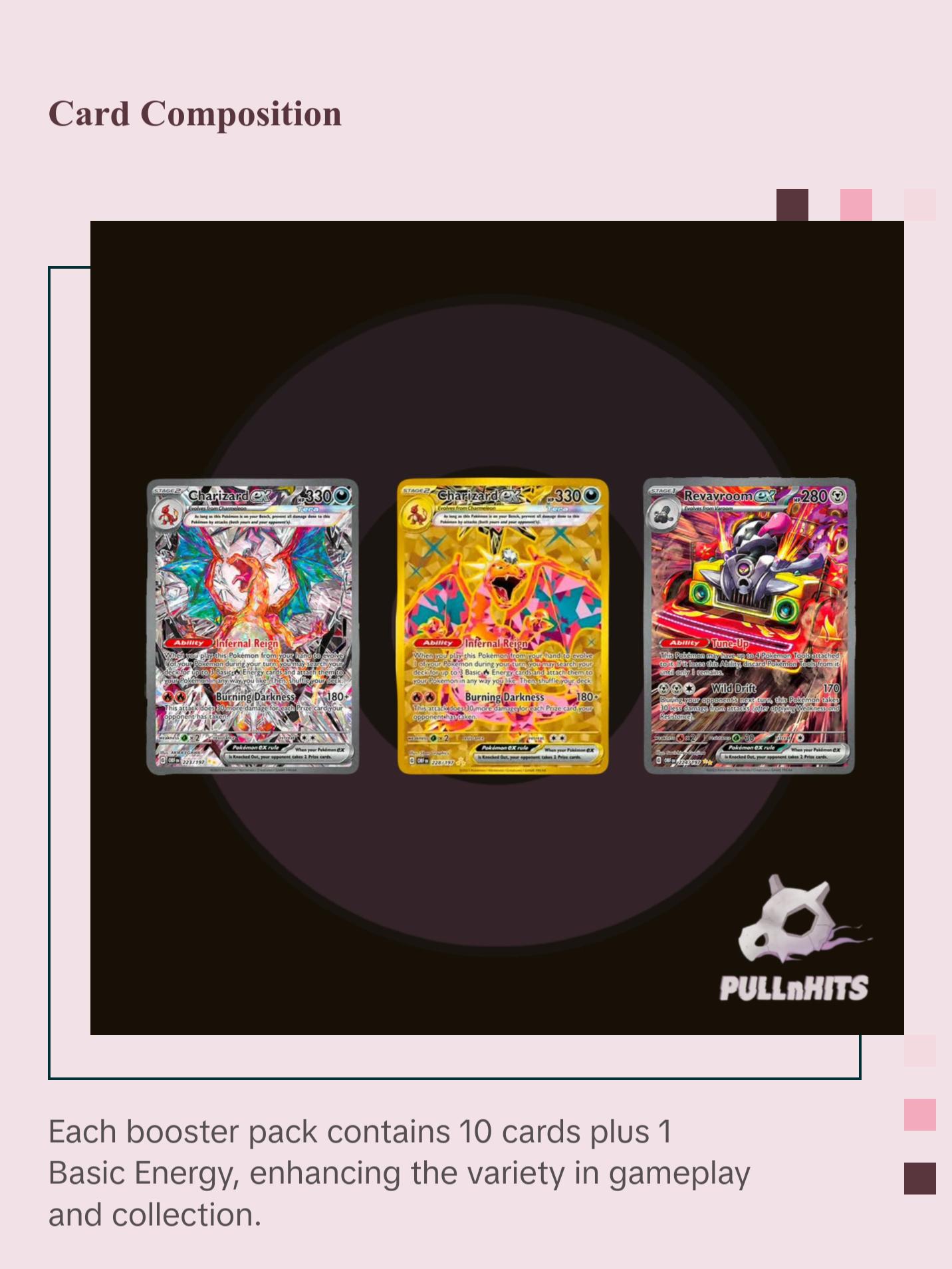 Dive into the inferno of the Pokémon TCG: Scarlet & Violet—Obsidian Flames! Charizard ex surges with dark powers, illuminating the night. Terastal phenomena transform Pokémon ex like Tyranitar and Eiscue, giving them unique types. Dragonite ex and Greedent ex showcase inner strengths. Revavroom ex and Melmetal ex promise to alter battles. This bundle includes x1 or x6 booster packs, each containing 10 cards and 1 Basic Energy. Cards vary by pack.