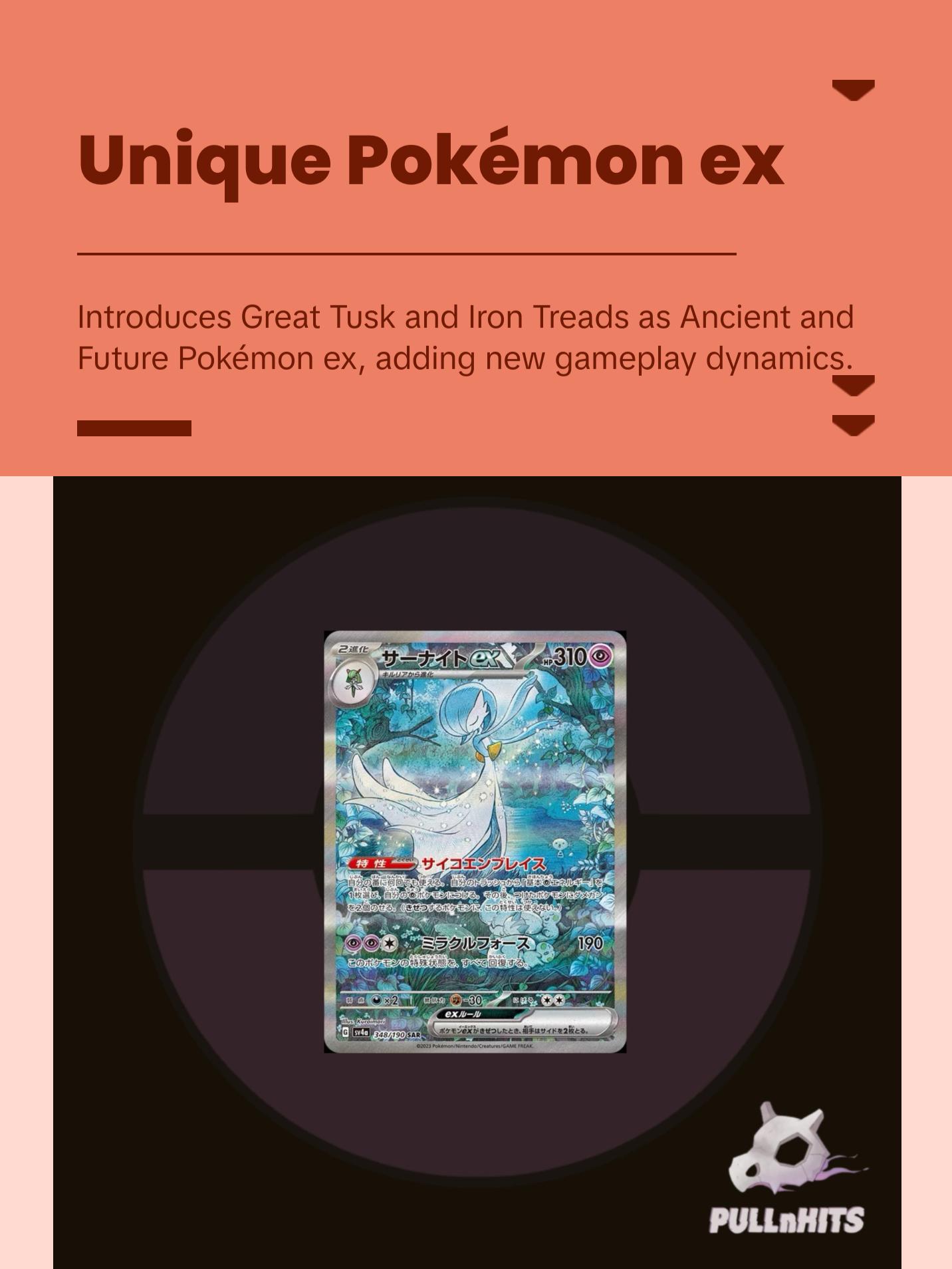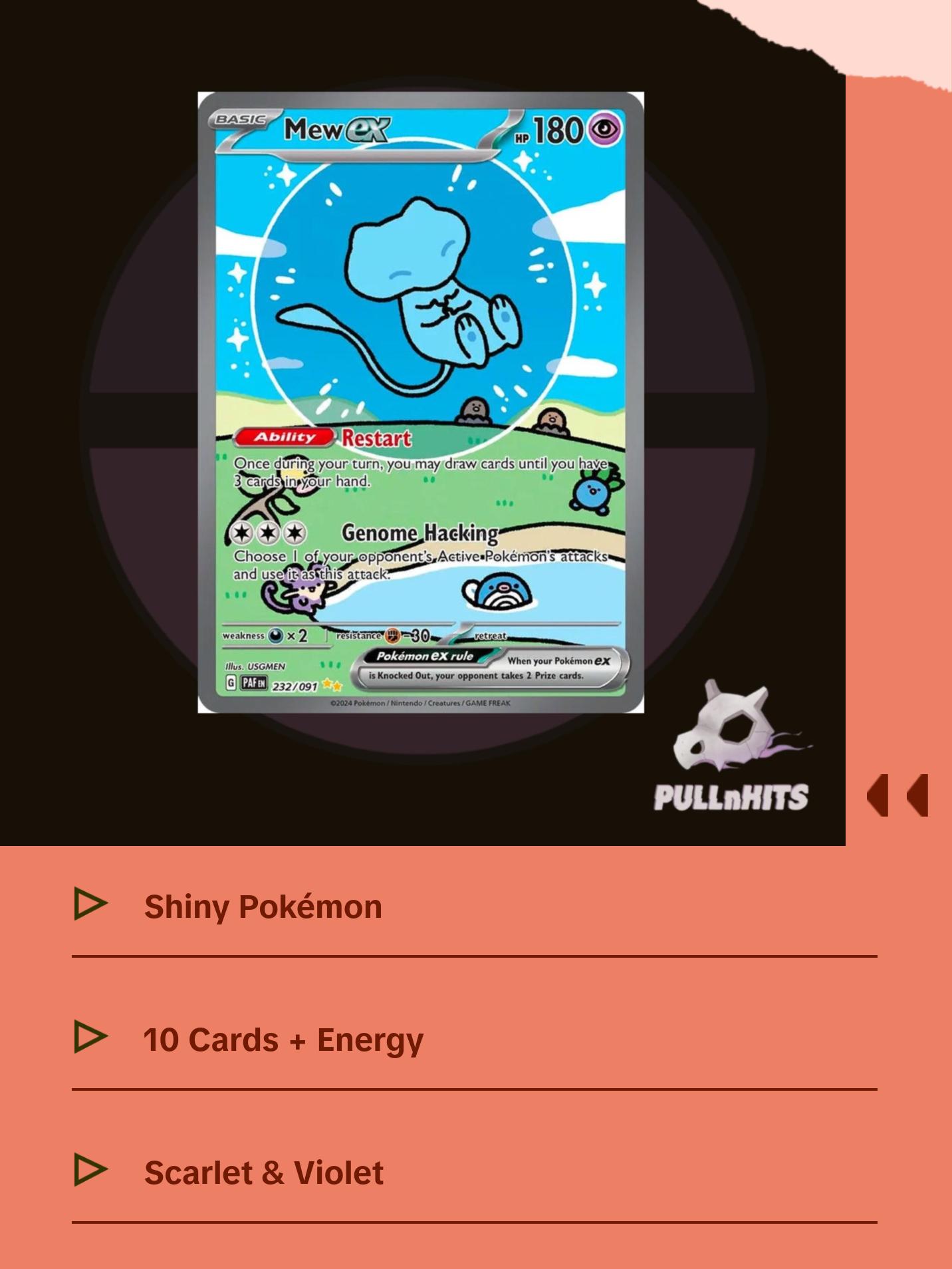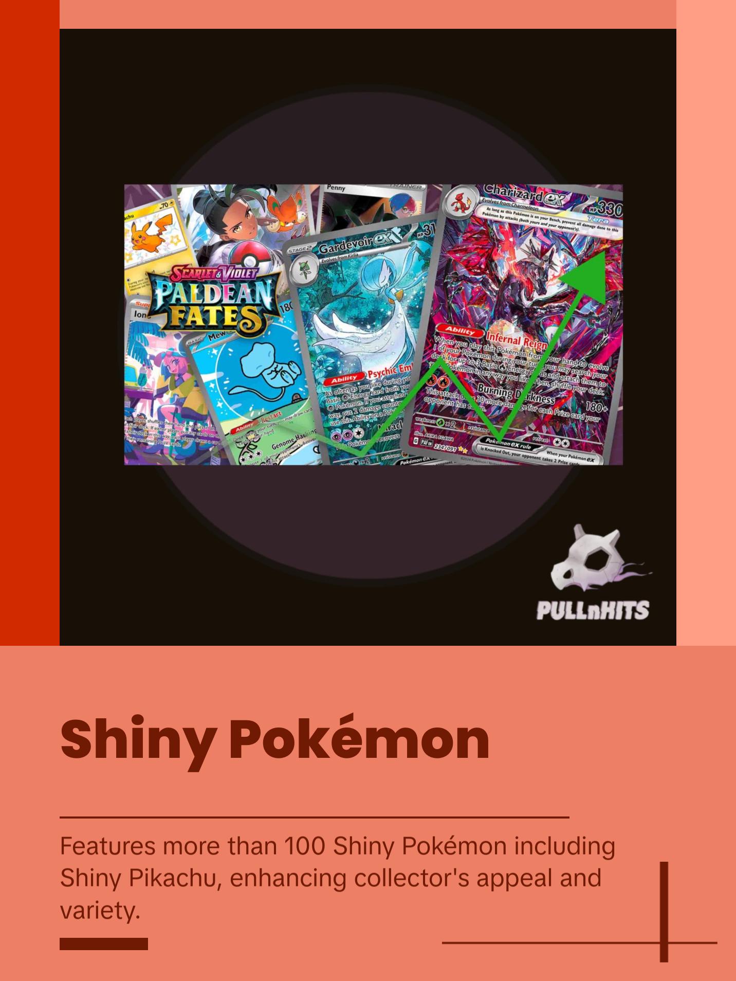 The spotlight glistens on Shiny Pokémon making their fated return to the Pokémon TCG! Shiny Pikachu blazes the path forward as Tinkaton, Ceruledge, Dondozo, and more than 100 other Shiny Pokémon follow. Meanwhile, Great Tusk and Iron Treads appear as Ancient and Future Pokémon ex, and Charizard, Forretress, and Espathra show off their own unique skills as Shiny Tera Pokémon ex. Shed some light and discover sparkling wonders in the Scarlet & Violet—Paldean Fates expansion!