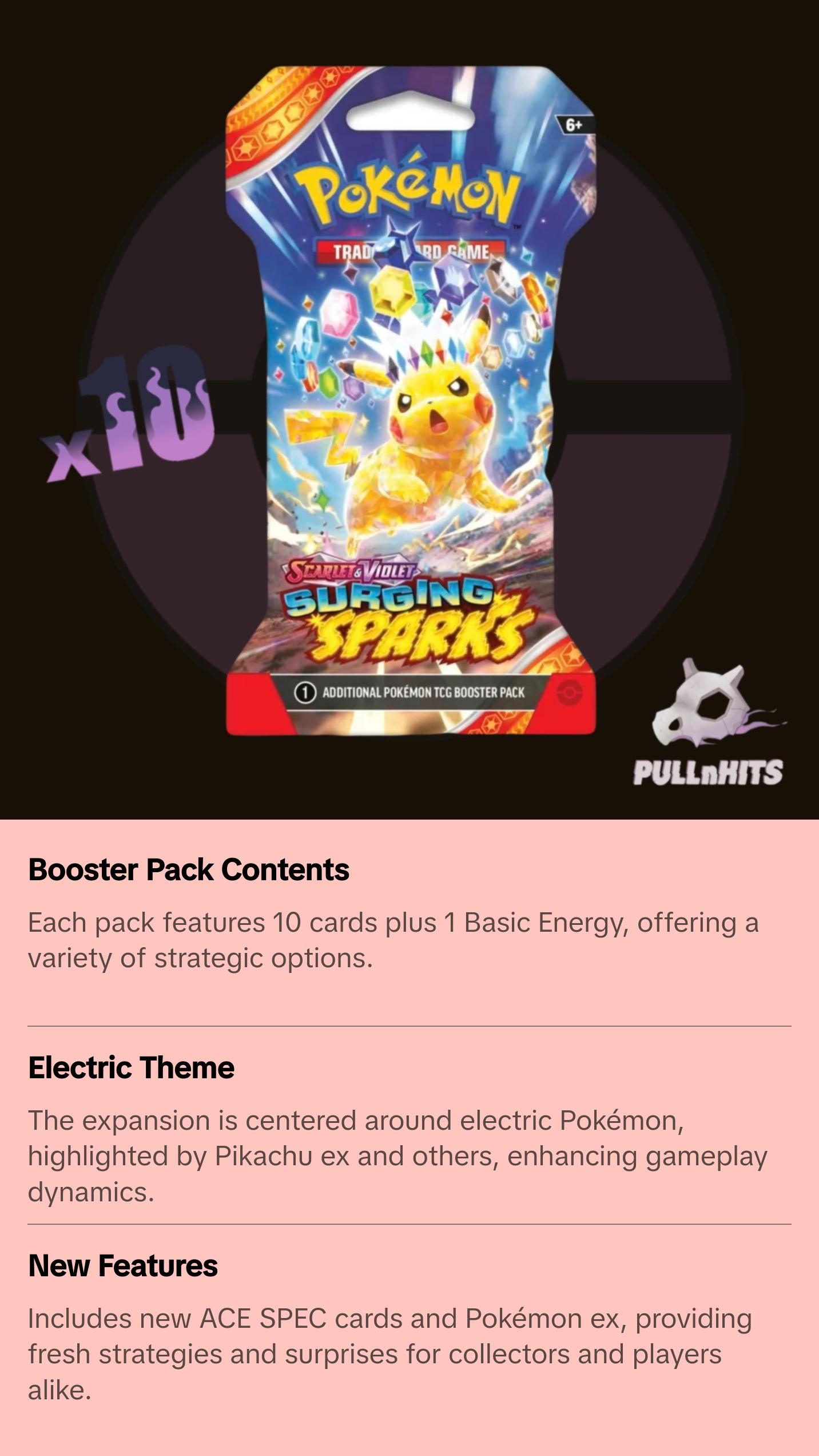 - Includes 1 Pokémon TCG: Scarlet & Violet—Surging Sparks booster pack